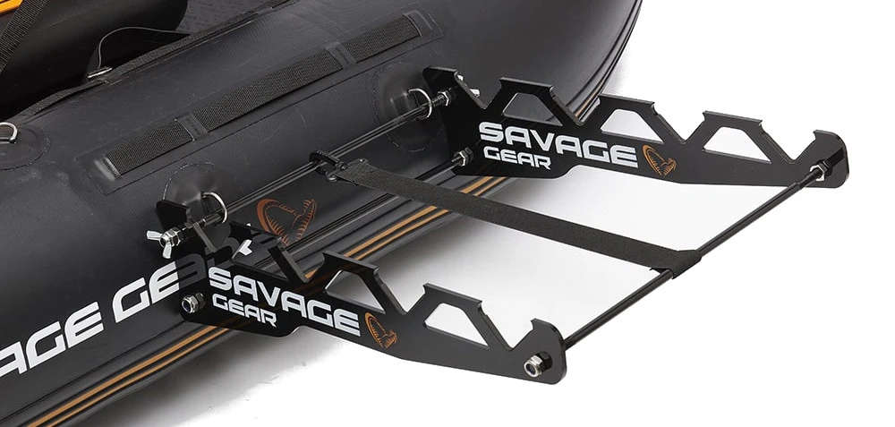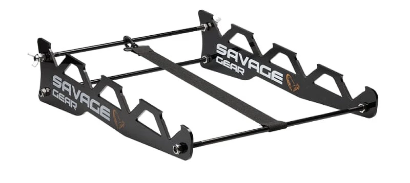 Why carry only one rod in your bellyboat when you can carry four? With the stylish Savage Gear bellyboat rod station, you are fully equipped for all situations during your next bellyboat fishing adventure by keeping up to four rods on hand. Made of strong and lightweight 6mm acrylic, the station features aluminum rods, a wide elastic strap to secure the rods and EVA protective strips to prevent the rods from slipping. The rod station comes with two carabiners so it can be easily hung on the side of the bellyboat if there are attachment points. For a PVC bellyboat, the included pads can be glued to the boat for attachment of the rod station. The nuts on the side allow for quick attachment and removal of the rod station.